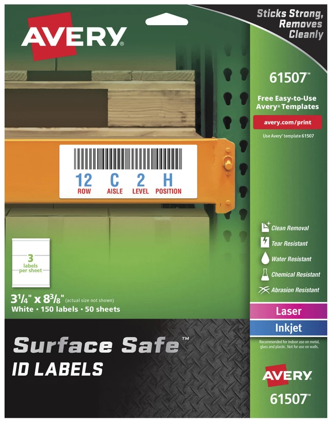 Labels feature a special adhesive that’s engineered to stick strong and remove cleanly from smooth hard surfaces including metal, plastic and glass. The durable, professional-grade material resists water, chemicals and abrasion, and provides superior bar-code scanning. They are great for use in warehouses, offices, factories, hospitality and more. The removable adhesive sticks securely but removes cleanly for easy, on-demand changes. Labels are recommended for indoor use, but are not recommended for use on walls. Sheets are compatible with both laser and inkjet printers.