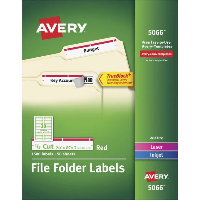 Create professional-looking file folder labels for easy and quick file identification. Labels with TrueBlock completely cover everything underneath so you can reuse mailing tubes, boxes and more. Labels have permanent adhesive that sticks without lift or curl. Each sheet of labels is acid-free, jam-free and smudge-free. Each sheet has labels sized to fit 1/3-cut tabs. File folder labels are compatible with inkjet and laser printers.