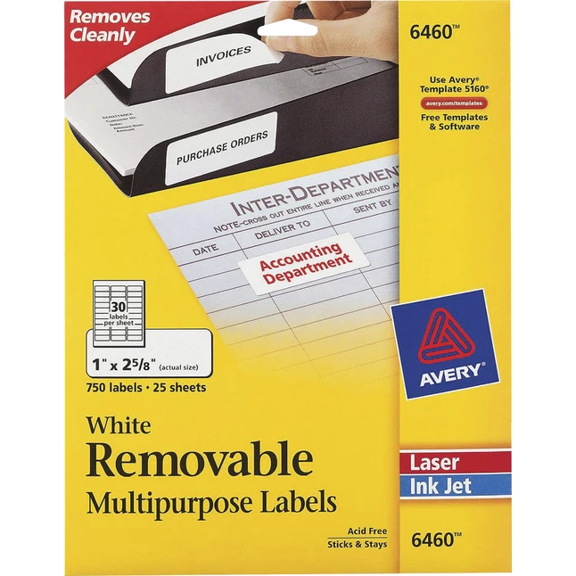 ID labels stick, stay and remove cleanly to make changes and revisions. The rectangular shape makes them ideal for binders, diskettes, file folders, cassettes, drawers, containers, boxes, shelves and more. Labels adhere to smooth surfaces, including paper, cardboard, plastic, wood, glass and metal. Labels are compatible with laser and inkjet printers. Avery offers many easy-to-use templates for Microsoft and many other popular software programs.