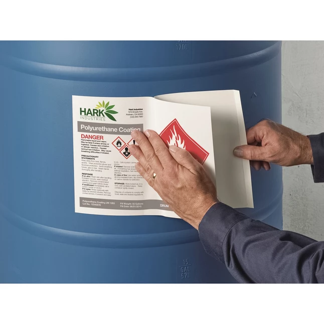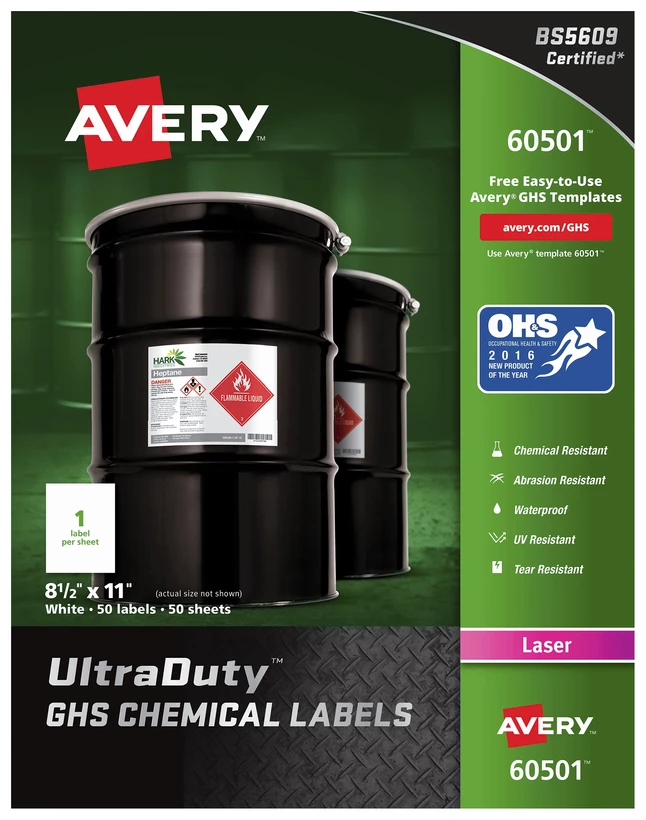 Get your organization’s chemical labeling in compliance with the Globally Harmonized System by using these durable labels. UltraDuty GHS Chemical Labels are specifically designed to withstand chemicals, abrasion, sun, water and extreme temperatures. They resist tearing and scuffing and stand up to frequent use. With high-performance adhesive, they pass the BS5609 protocol for 90-day seawater immersion. Polyester film labels are ideal for labeling for drums, pails and totes. Easily customize and print your required labels on demand using ready-to-use, free online templates or a special online, GHS Wizard labeling system. Customize labels with your company logo, lot numbers, bar codes or other information, and update as needed. Print using standard sheet-fed laser printers.ย