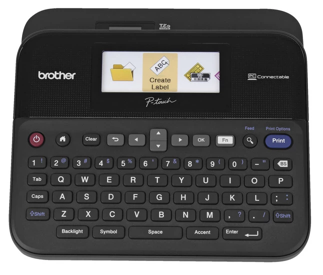 Create high-resolution labels up to 24mm wide with this label maker that features a QWERTY keyboard for a fast input and a built-in automatic cutter. Backlit graphical display shows how your label will look before you print. One-touch formatting offers quick access to fonts, symbols, frames and patterns. Use the included USB cable to connect it to your computer for additional functionality. Label maker prints up to seven lines of text using pre-installed fonts and graphics or even the ones on your computer.
