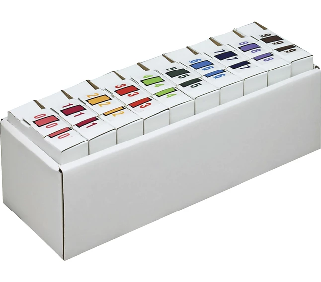 Self-adhesive, color-coded label rolls feature a wraparound solid color bar and colored character printed on a white background. Colors are compatible with end tabs systems using the bar-style format. Labels are scored to provide a wraparound color bar. Each roll includes 500 labels and comes in a dispensing box.Β Labels are 1-1/4 inch wide x 1 inch high before folding.