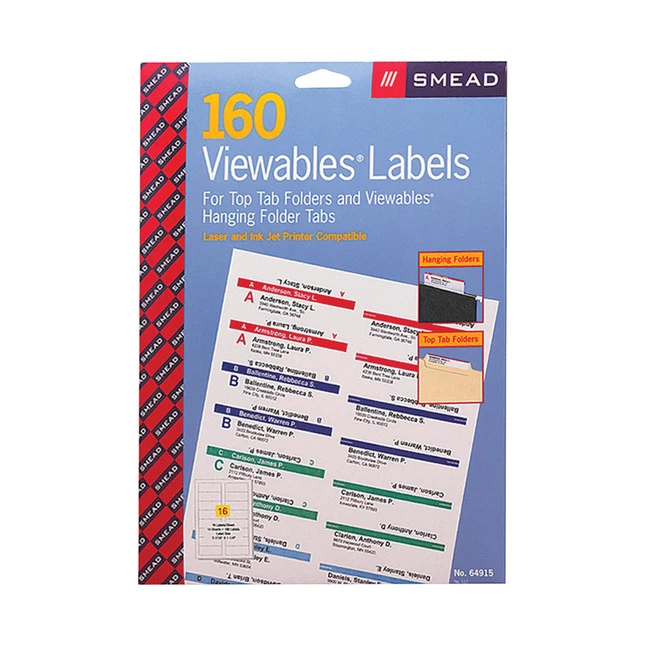 Label refill is designed for use with the Smead Viewables Labeling System. Labels are specially designed for patented, three-sided hanging folders and file folder tabs (sold separately). The labeled tab allows you to read the label from the front, top or back. When used on folders with tabs in the same position, a continuous line of color is created for faster filing and retrieval. Color breaks your system into smaller sections and allows misfiled folders to stand out. Conveniently store labels in their reclosable package. 160 labels come on letter-size sheets that are compatible with laser and inkjet printers.